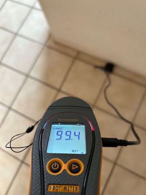 Unlike a hidden drip, these “blowouts” often result in the catastrophic scenes seen in the image below: collapsed drywall, flooded kitchens, and warped flooring. In areas where we suspect deep saturation—like behind thick drywall or inside insulation—we use calibrated pin-style meters. These professional-grade sensors provide a precise percentage of “Moisture Content” (MC).
